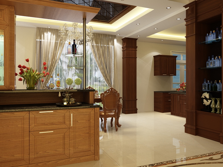 Nội thất phòng khách theo phong cách cổ điển châu âu kết hợp giữa gỗ nền đá hoa cương làm toát lên vẻ sang trọng của căn nhà.